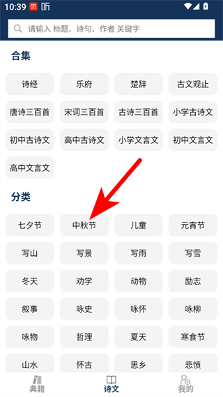2、在诗文页面,选择分类中的诗词主题,如中秋节,进入对应诗词列表界面。