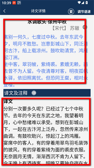 4、在诗文详情页面,即可查看诗词原文及译文注释等内容。