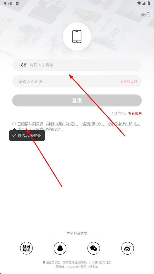 1、勾选已阅读并同意追书神器用户协议、隐私保护、侵权申诉和未成年人个人信息保护规则后,可点击手机号一键登录,也能选择下方身份认证等其他登录方式完成账号登录。