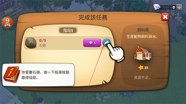1、在任务界面点击指导按钮,获取帮助来收集5个石头。