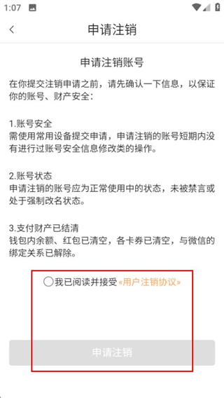 4、账户与安全页面点击注销账号可进入申请注销页面。