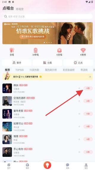 2、在歌曲列表中搜索/选择想演唱的歌曲,点击歌曲右侧k歌的按钮。