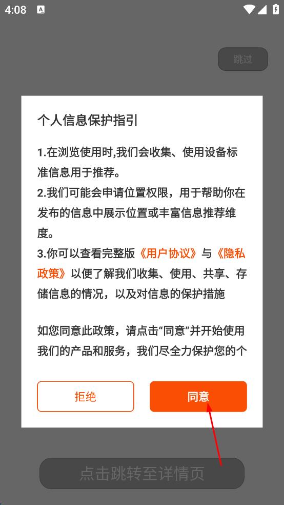 1、打开政协云App,在隐私保护提示页面,点击“同意”按钮。