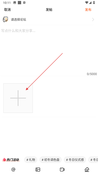 3、进入发帖页面之后,输入内容,点击下方加号。