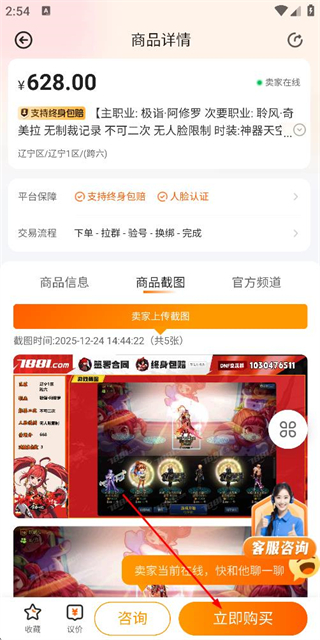 4、在商品详情页后点击立即购买,完成买账号操作。