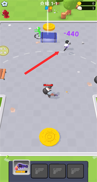 1、攻击丧尸后角色会出现数值扣除,此时需操控角色移动到金币区域拾取金币,补充资源维持状态。