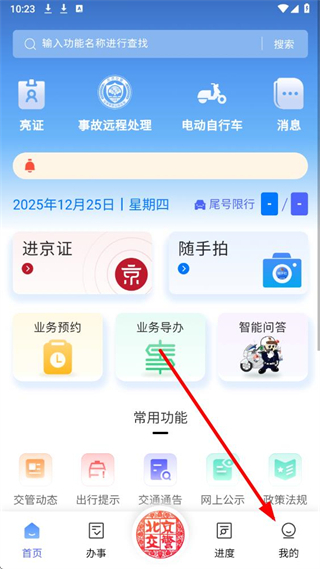 1、进入北京交警app,点击首页底部我的选项,进入我的页面。