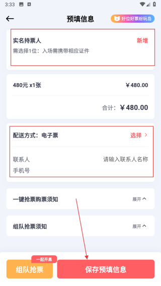 4、填写实名持票人、配送方式、联系人等信息,点击保存预填信息。