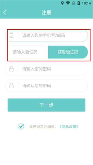 3、设置密码并确认密码,勾选同意隐私政策后点击下一步完成注册。