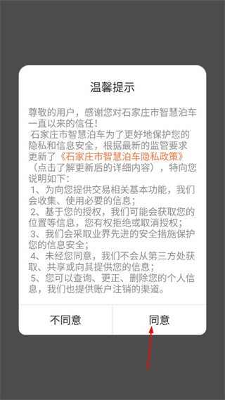 1、打开石家庄市智慧泊车APP,查看弹出的温馨提示弹窗,点击同意按钮进入应用。