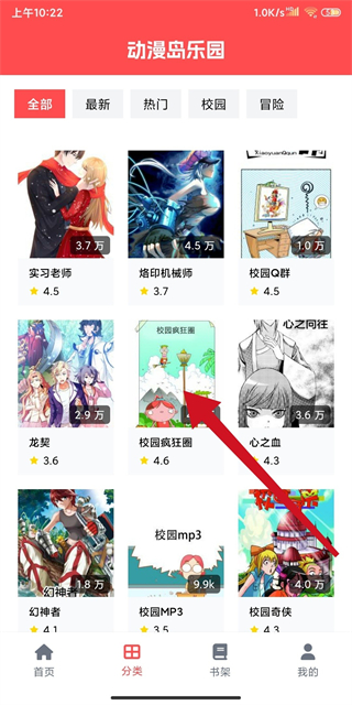 2、在分类页面中,选择喜欢的漫画如校园疯狂圈,进入漫画详情页。