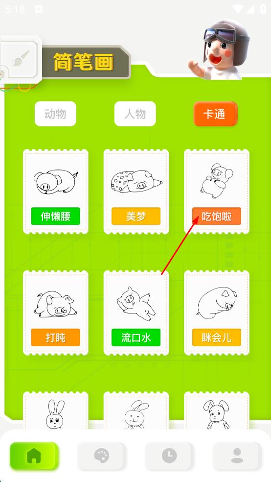 3、进入所选分类页面后,挑选想要绘制的简笔画图案,比如“吃饱啦”图案,点击该图案,进入简笔画绘制页面。