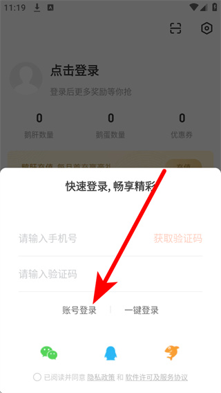 3、在登录窗口中点击账号登录选项,切换到账号密码登录界面。