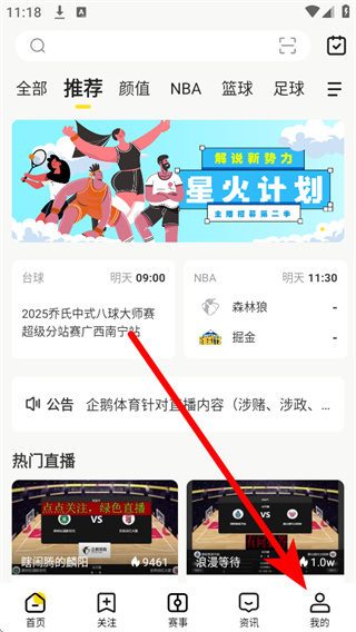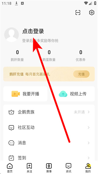 1、打开企鹅体育,点击底部导航栏的我的,进入个人中心页面。