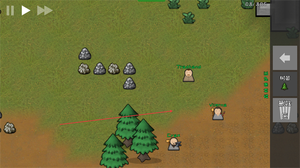 1、在殖民地地图中与NPC互动,同时观察资源分布如树木、岩石,规划发展区域。