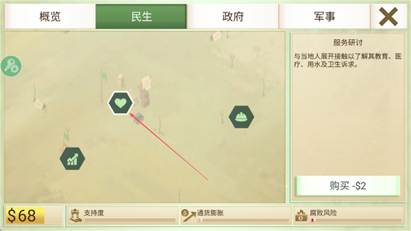 4、进入民生界面,选择服务研讨,花费$2解锁相关民生项目,提升区域支持度。