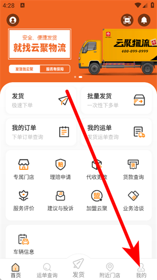 1、在云聚物流首页页面,点击底部我的,进入个人中心页面。