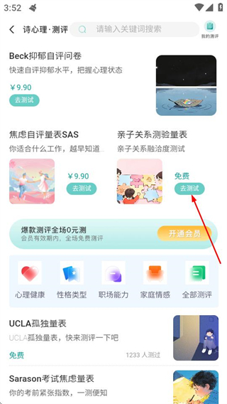 1、进入诗心理后,点击心理测评板块的立即前往按钮,可进入测评列表页面。