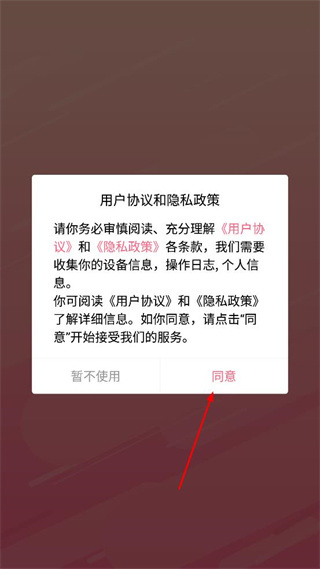 1、打开医孕宝成长孕育APP,查看弹出的用户协议和隐私政策提示,点击同意按钮进入应用。