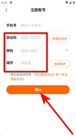 4、依次输入验证码和密码,点击选择城市,点击确认,完成账号注册。