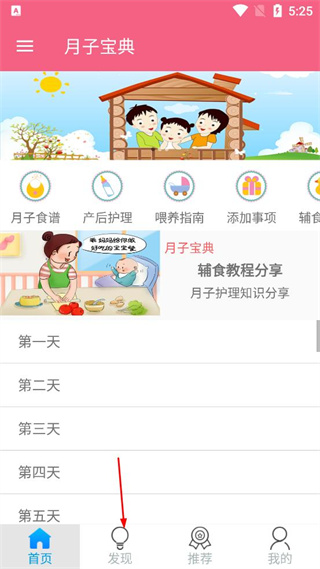 1、打开月子宝典母婴饮食指南APP,在首页找到底部导航栏的发现选项,点击进入分类页面。