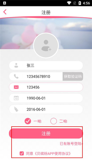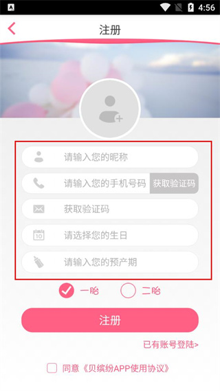 3、在注册页面依次填写昵称、手机号码、验证码、生日、预产期等相关信息。