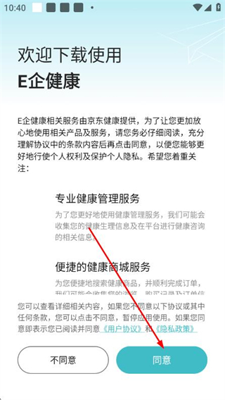 1、打开E企健康APP,在欢迎页面点击同意,进入登录选择界面。