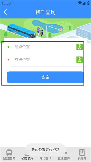 4、在换乘查询界面,依次填写起点位置和终点位置,点击查询按钮获取公交换乘方案。