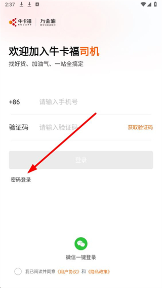 3、勾选同意协议,点击登录按钮,即可完成万金油司机端的密码登录操作。