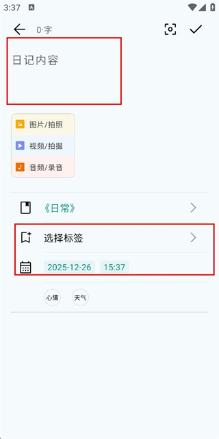 2、在编辑页面填写日记内容,选择标签及日期等信息。