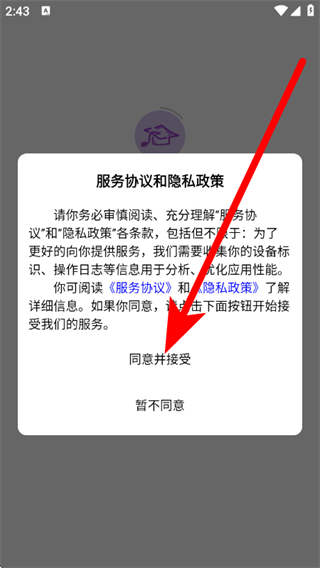 1、在爱学词,在提示弹窗,点击同意并接受。