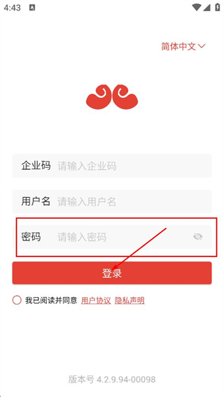 2、在巡店助手登录页面,依次填写企业码和用户名对应的内容。