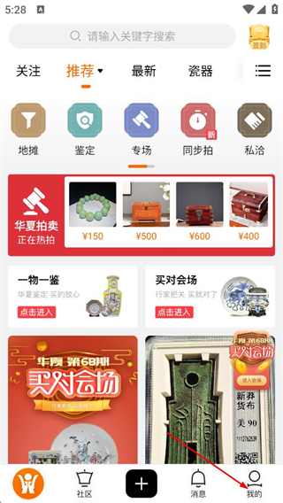 2、在华夏收藏首页,点击底部的我的选项,进入登录相关页面。