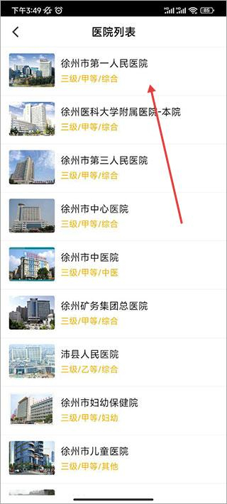 1、打开徐州健康通APP首页,点击预约挂号选项,进入医院选择页面。