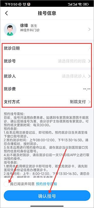 5、进入挂号信息页面,填写就诊号、就诊人等信息,勾选我已阅读并同意后,点击确认挂号完成操作。