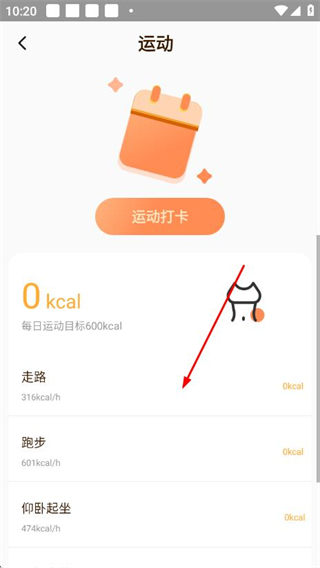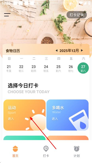 1、打开食物热量APP,在首页点击运动模块的进入,进入运动打卡页面。