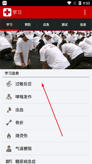 1、打开中国红十字急救APP,在学习页面选择目标急救主题,点击进入详情页。