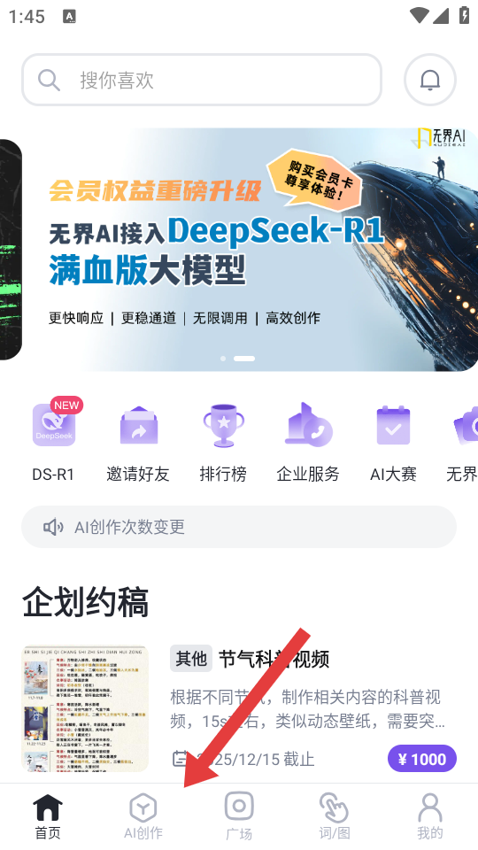 1、打开无界AI APP,点击底部导航栏的AI创作,进入AI图像生成的页面。