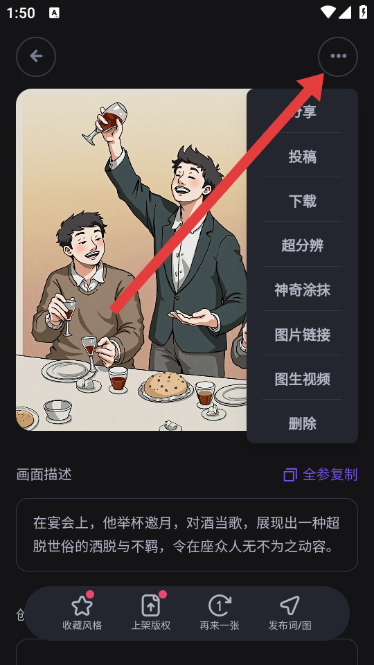 4、图像生成后,点击右上角更多的按钮,可以选择分享等操作,也可进行风格收藏或上架版权。