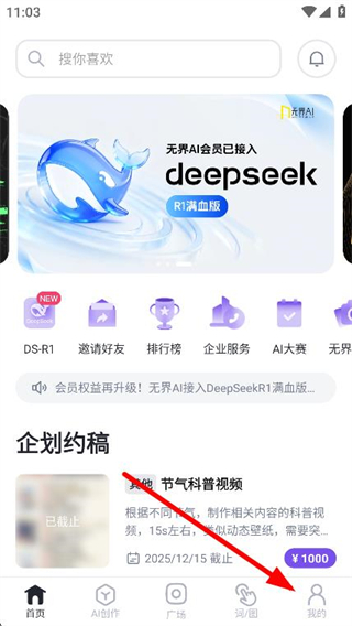 1、打开无界AI App,点击页面底部右侧的我的选项。