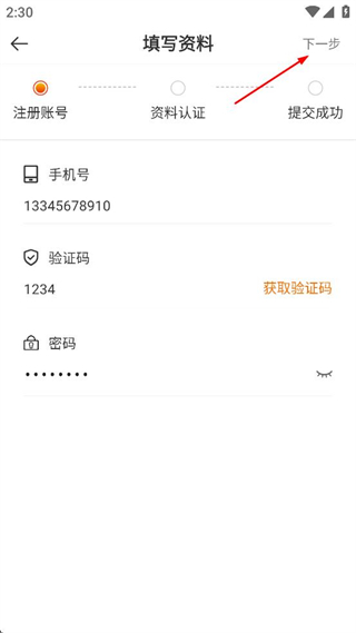 4、完成手机号验证码密码的填写后,找到页面右上角的下一步按钮,点击进入后续流程。
