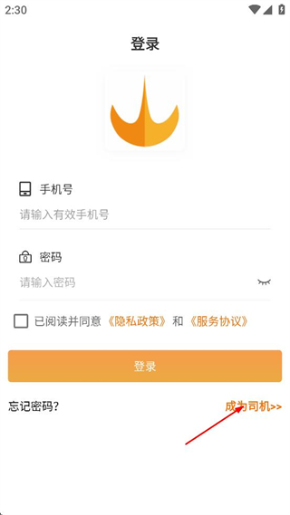 2、进入登录页面,找到成为司机选项并点击,跳转至填写资料的注册账号环节。