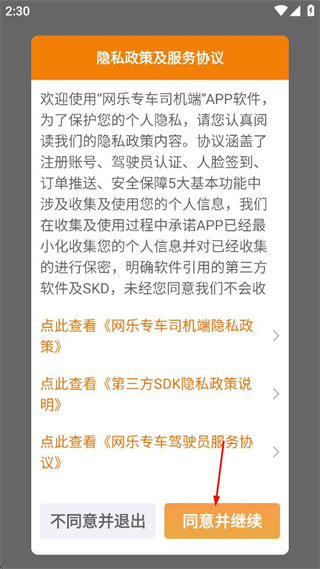 1、打开网乐专车司机端,查看隐私政策及服务协议,点击同意并继续按钮,进入后续页面。