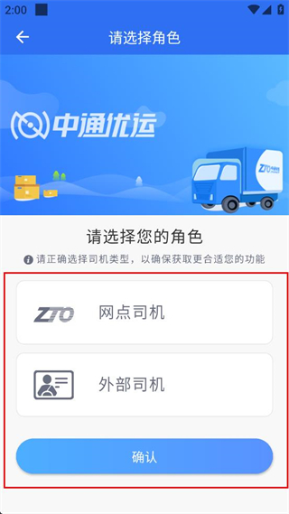 2、登录后进入角色选择页面,在网点司机和外部司机两个选项中选定对应角色,点击确认按钮。