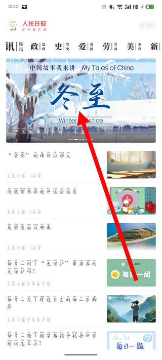 1、在人民日报少年客户端首页,找到目标内容并点击,进入该内容的详情页面。