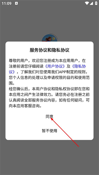 1、阅读用户协议及隐私协议后,点击同意,进入应用。