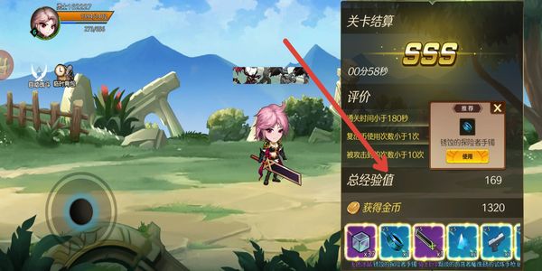 4、战斗结束后查看关卡结算界面,获取总经验值和金币等奖励道具,完成本次关卡的挑战流程。