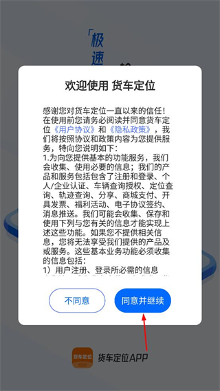 1、查看弹出的欢迎提示内容,阅读其中的用户协议和隐私政策,点击同意并继续按钮。