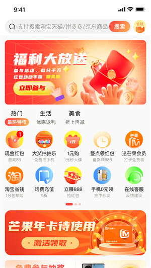 - 为用户提供了非常多的福利,各种现金红包、签到领奖、优惠券、折扣、购物积分、分享好礼等多种活动;