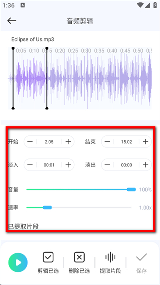 4、确认剪辑效果后,点击底部的保存,完成音频剪辑操作。